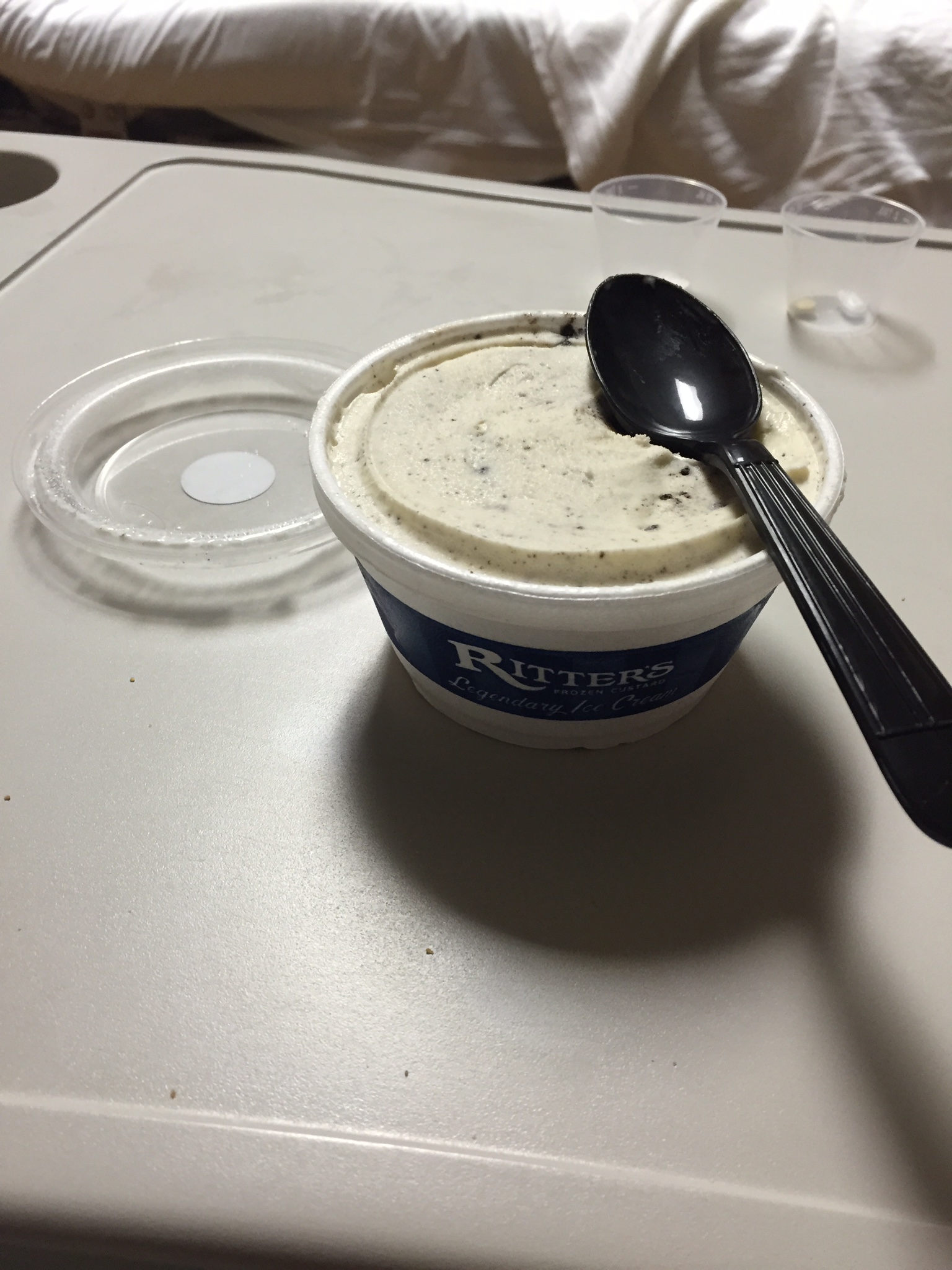 I love the nurses on 3 East.  I wouldn’t dare try to name the great nurses I’ve had, since I’d surely miss a few.  However, one bought me Ice Cream and that is a sure way to get mentioned on my blog.  Lisa works nights and is fluent in sarcasm as well so we’ve had a lot of good times.  During my last stay (which we both thought would be my absolute last stay on the unit) she covertly put my Cipro in my trazadone cup so I wouldn’t take it with my night meds(you have to have been REALLY paying attention to understand this*).  Last time around Lisa and I had been talking about favorite ice cream flavors.  Mine is Cookies N Cream.  So as a farewell gift to me, Lisa went downstairs to the cafeteria where they have a Ritter’s freezer and bought some Cookies N Cream ice cream for me.  It was delish and especially nice coming from someone I bonded so well with.  Thank you Lisa for your farewell gift!
