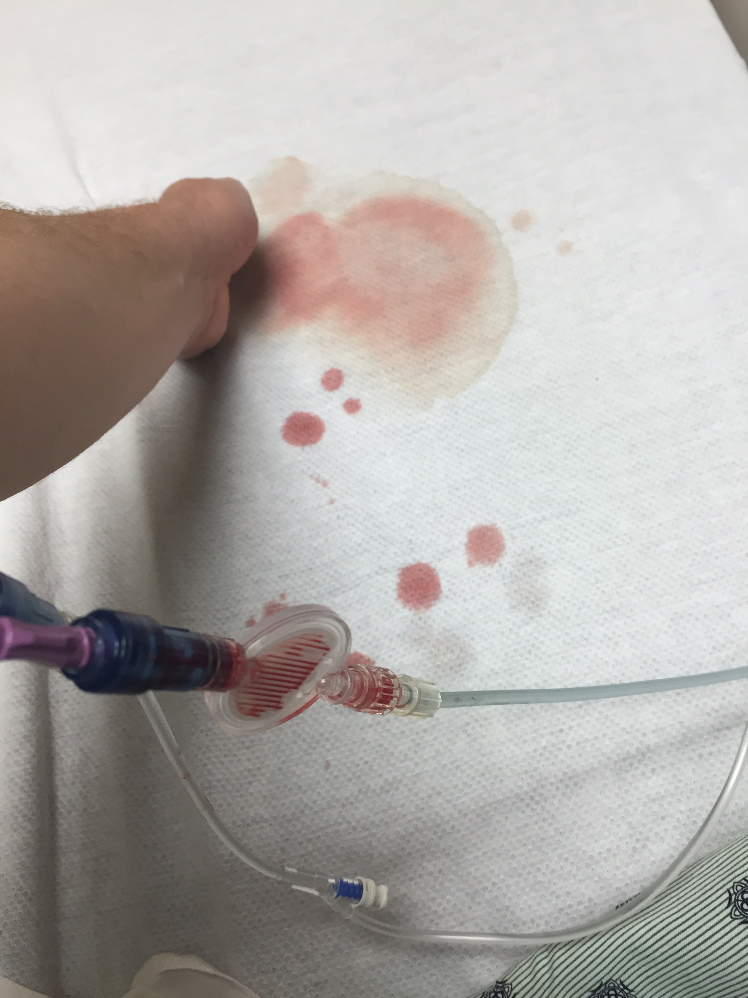 I was a little embarrassed  because I hadn’t gotten Lisa anything.  I mean, I did put her name in my neuro check, but I also wrote Sydney’s name and the ladies want something special.  I know Lisa is a great nurse and great nurses love challenges.  So for Lisa’s farewell, I woke up with a blood and blinatumomab puddle on my mattess complete with blood dripping from my IV line.  I pressed my nurse call button and said my IV line was leaking and I needed help.  One lonely tech came through the door and I immediately said “You’re gonna need more people.”  Right behind her was Lisa ready to save the day.  Granted, saving the day didn’t take too much.  She had to screw on part of the line that came  loose, but still, she looked the part.  She got me all cleaned up, flushed the lines appropriately and hooked everything back up.  Lisa, I hoped you liked my farewell gift as much as I liked yours 🙂